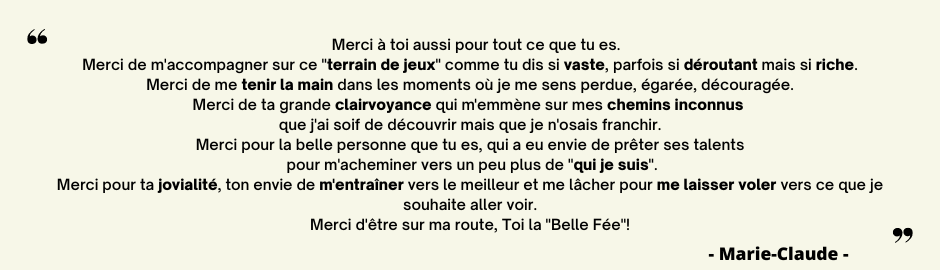 En plein cours de mon 2eme accompagnement je souhaite te témoigner, Marion, de tout ce que ta facilitation m'a apporté et m'apporte sous forme de célébrations :