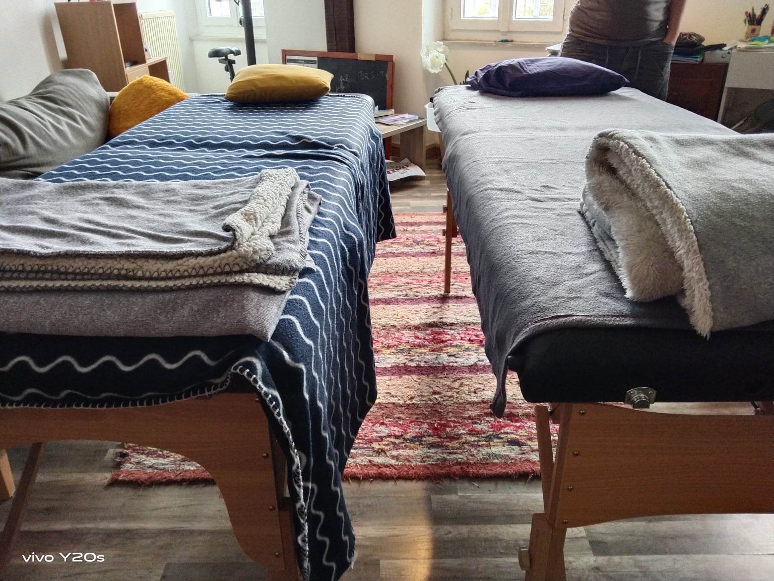 Après un court échange avec la personne, je l'invite à s'allonger sur une table de massage, toute habillée ( sauf les chaussures). Je l'installe le plus confortablement possible avec des coussins et des couvertures. Puis, je touche un petit peu les pieds et les mains avant de me consacrer aux 32 points qui se situent sur la tête.