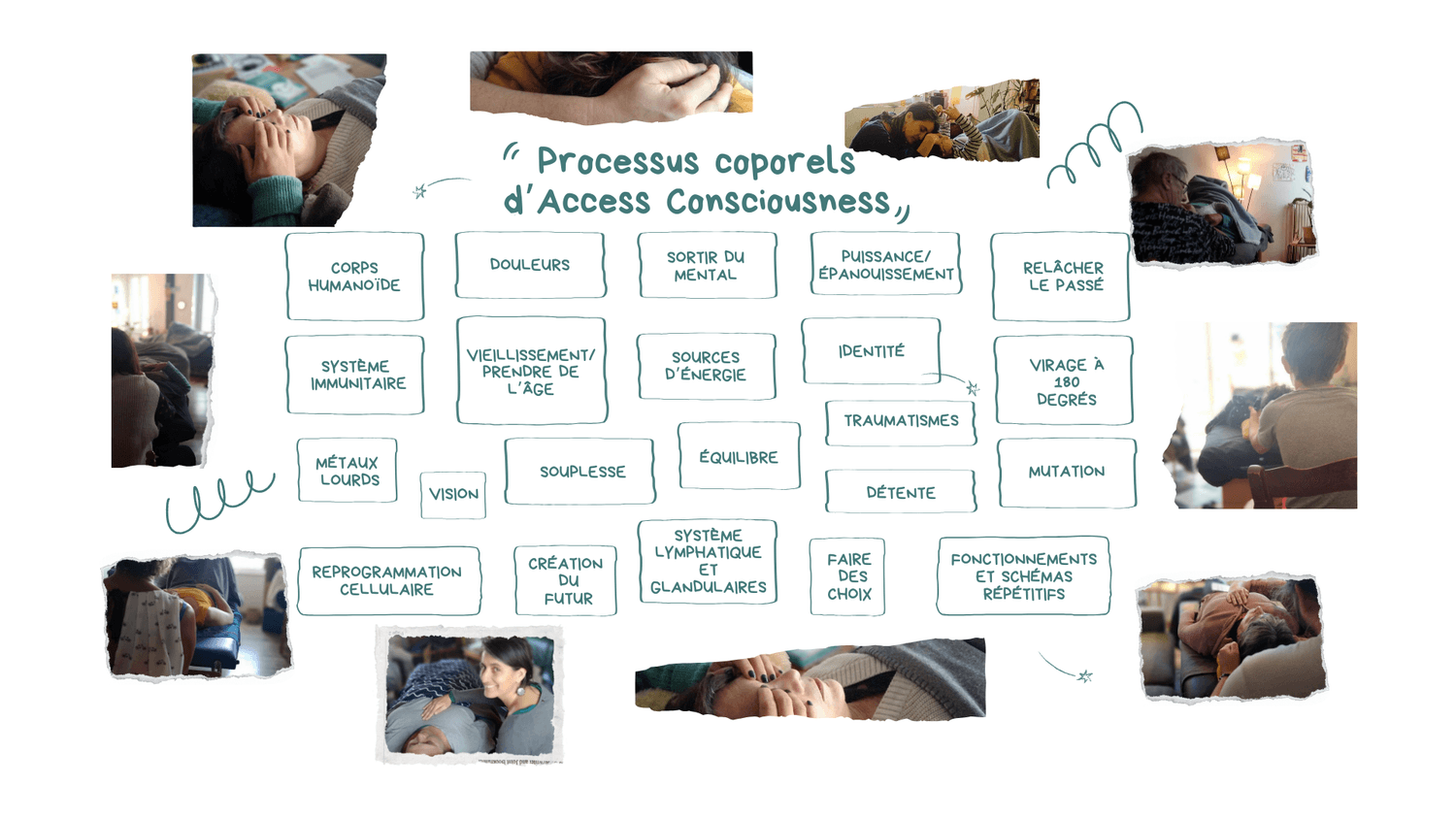 Access Consciousness propose une grande variété d'outils visant à faciliter une plus grande conscience et à libérer les limitations dans tous les aspects de la vie, que ce soit au niveau physique, émotionnel, mental ou spirituel. Les processus corporels en font partie.